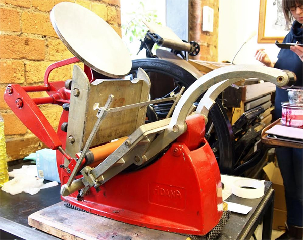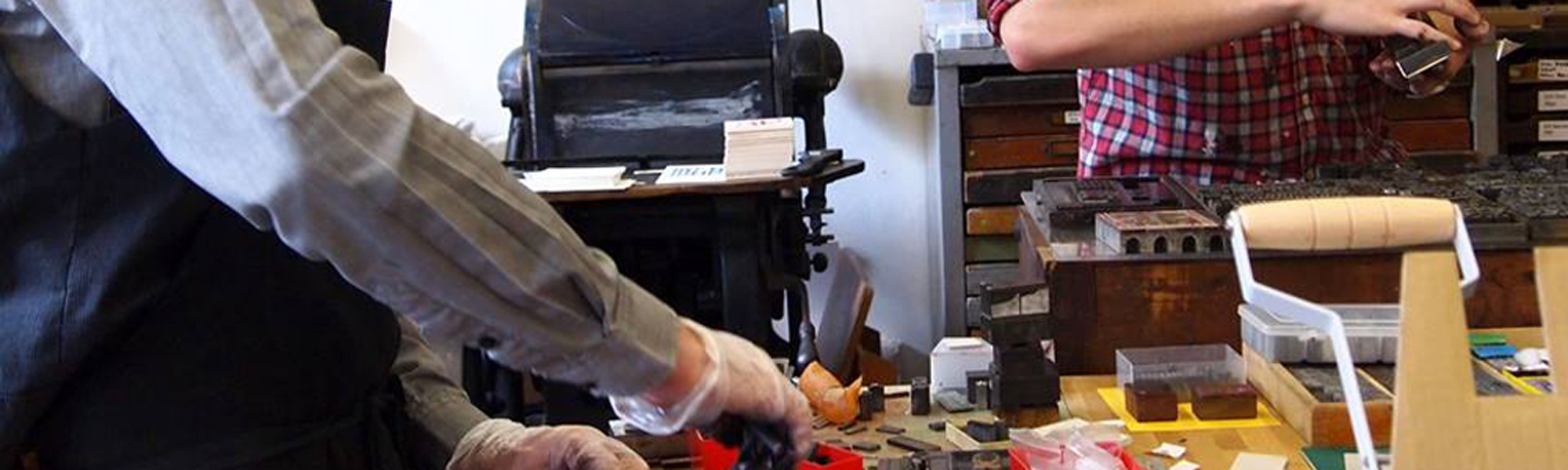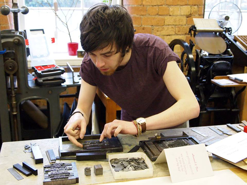 When Chris isn’t printing, he’s sorting through the booty we brought back from Chapel-en-le-frith. There are some amazing finds… and I’m not just talking about the type! A rat’s skull and rodents spine (pictured in the type tray below) are just some of the more interesting items.